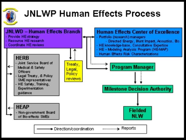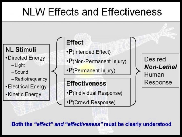 4th European Symposium on Non-Lethal Weapons – Stadthalle Ettlingen, Germany May 21-23, 2007 – “The success of a nonlethal device depends upon the ability of the device to deliver a payload which produces the desired human effect, physiological, or behavioral, or both. Further, that effect must support an operational requirement. In short, the device must work and it must serve a purpose. It is difficult to design successful directed energy nonlethal weapons because 1) psychological effects of nonlethal weapons are more subtle and variable than traditional munitions and 2) psychological effects research for nonlethal weapons is still in its infancy. In response to these challenges, the US Air Force Research Laboratory has initiated a research effort to directly assess behavioral responses to directed energy nonlethal weapons (DE NLWs). Moreover, this effort strives to identify very specific quantifiable behaviors, which if induced through DE NLWs, are implicated in increased mission success for specific operational scenarios. In this manner, AFRL is not just determining that nonlethal weapons are effective, but that they are effective towards desired operational outcomes. The program has both a theoretical and applied track. The theoretical track blends known human experimental research in avoidance behavior and motivation with decision-making to develop a causal model for predicting individual response to nonlethal weapons. Through computational modeling, the applied track seeks to quantify correlational relationships between nonlethal weapon use and individual behavior. Computational approaches under consideration include Bayesian models, neural networks, and traditional linear and logarithmic models. Development of predictive behavioral models in response to nonlethal weapons use will directly support operational deployment decisions of current nonlethal weapons, and provide theoretical and empirical support for behavioral effects-based design of future nonlethal weapons.” – Alan Ashworth PhD Directed Energy Bioeffects Division Air Force Research Laboratory