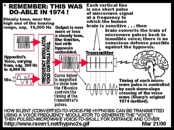 One question is, if they are sending directly to the brain, at least part of the time, why would they bother to make it sound like an external acoustic signal coming in through the ears? One reason is that in a noisy environment their signal must “compete” with natural external sounds, and so to be noticeable it has to fit in with the rhythm and frequency. Another possible reason is that they do not want it to be too noticeable. They may try to hide such sounds in external ambient frequencies to give them more of a subliminal effect, so they don’t stand out like a sore thumb in the mind. Another likely reason, in the case of a direct brain send, is that they want to misdirect the victims to think it is an external acoustic modulation. This way the victim may claim to hear things in external signals which others truly cannot hear, and will be less likely to detect or measure the true send signal. Finally, it may simply be a way to drive a victim crazy and induce a schizophrenia-appearing condition in those susceptible to such conditioning. By repeatedly trauma-conditioning the victim to associate berating voices with external sounds, the victim will tend to anticipate them even when hearing sounds without the overlaid harassment. (Can you imagine berating phrases — psychologically tailored to psychologically harm you — bombarding you for weeks and months at a time, hundreds of thousands of times, in a psychic driving fashion?)