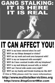 “Organized Stalking is a form of terrorism used against an individual in a malicious attempt to reduce the quality of a person’s life so they will: have a nervous break-down, become incarcerated, institutionalized, experience constant mental, emotional, or physical pain, become homeless, and/or commit suicide. This is done using well-orchestrated accusations, lies, rumors, bogus investigations, setups, framings, intimidation, overt or covert threats, vandalism, thefts, sabotage, torture, humiliation, emotional terror and general harassment. It is a “ganging up” by members of the community who follow an organizer and participate in a systematic “terrorizing” of an individual.” – Mark M. Rich
