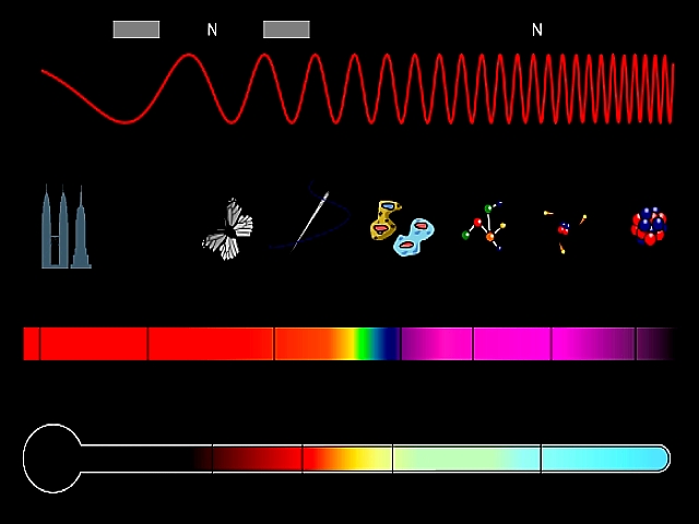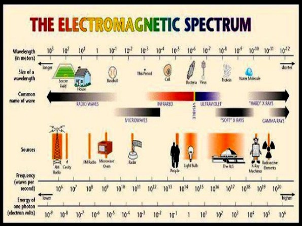 wave-like pattern – “…We may think that radio waves are completely different physical objects or events than gamma-rays. They are produced in very different ways, and we detect them in different ways. But are they really different things? The answer is ‘no’. Radio waves, visible light, X-rays, and all the other parts of the electromagnetic spectrum are fundamentally the same thing. They are all electromagnetic radiation. Electromagnetic radiation can be described in terms of a stream of photons, which are massless particles each traveling in a wave-like pattern and moving at the speed of light. Each photon contains a certain amount (or bundle) of energy, and all electromagnetic radiation consists of these photons. The only difference between the various types of electromagnetic radiation is the amount of energy found in the photons. Radio waves have photons with low energies, microwaves have a little more energy than radio waves, infrared has still more, then visible, ultraviolet, X-rays, and the most energetic of all, gamma-rays…” (Electromagnetic Spectrum)